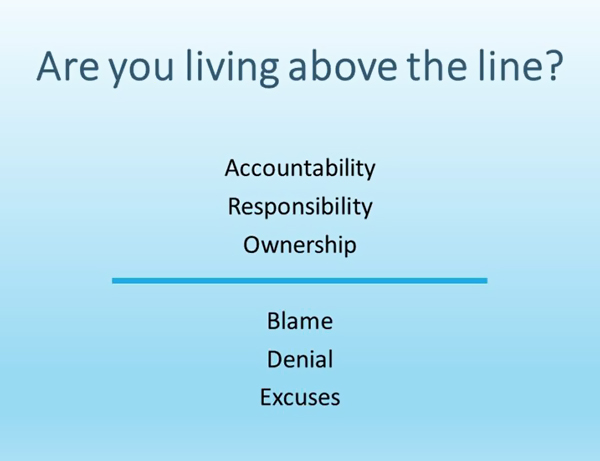 Are you living above the line where you take responsibility, are accountable for your actions, and take ownership of every aspect of your life? Or do you live more below the line blaming anyone other than yourself, denying what may be difficult to accept, and making excuses for your behavior?